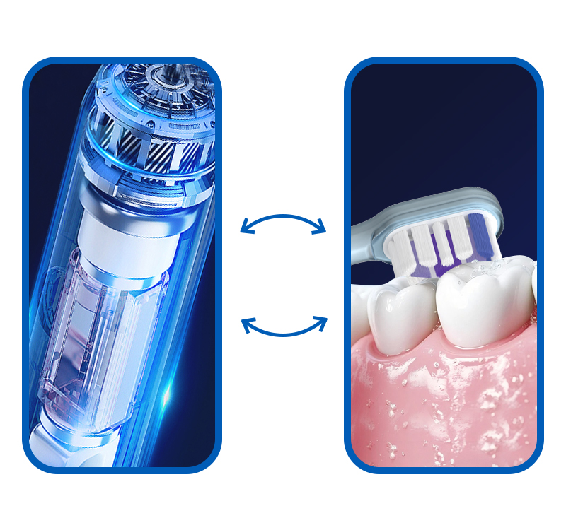 It delivers high-frequency lateral motion (like a sonic brush) while simultaneously adding a gentle 15°–60° vertical sweep, mimicking the Bass brushing technique recommended by dentists. This dual-action motion enhances plaque removal along the gumline while being exceptionally gentle on soft tissues—perfect for adults and children alike.